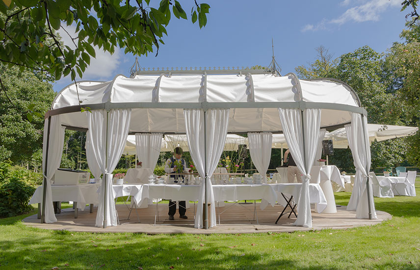 Der Gartenpavillon liegt eingebettet im Grünen und bietet einen geschützten Rahmen für kleinere Gesellschaften. An Einzeltischen finden bis zu 25 Personen Platz, in Blockbestuhlung bis zu 20 Personen. Der Pavillon eignet sich besonders für intime Feiern, Empfänge oder gesellige Runden unter freiem Himmel.