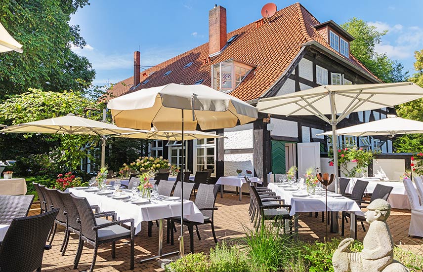 Unsere großzügige Sommerterrasse bietet viel Raum für Feiern unter freiem Himmel und fügt sich harmonisch in den Garten des Forsthauses ein. Mit Platz für bis zu 120 Personen eignet sie sich ideal für Empfänge, Sommerfeste oder ausgelassene Feiern in offener, entspannter Atmosphäre.