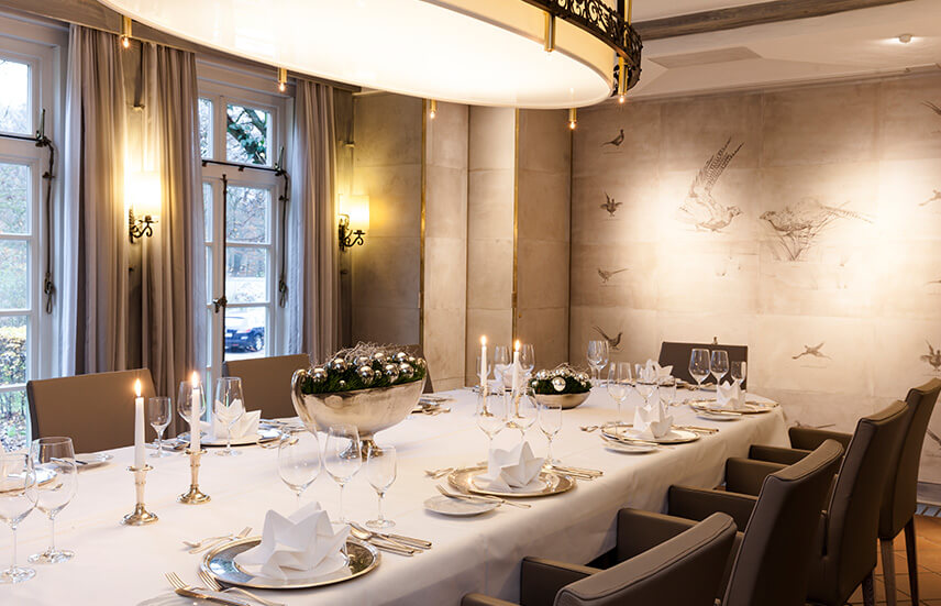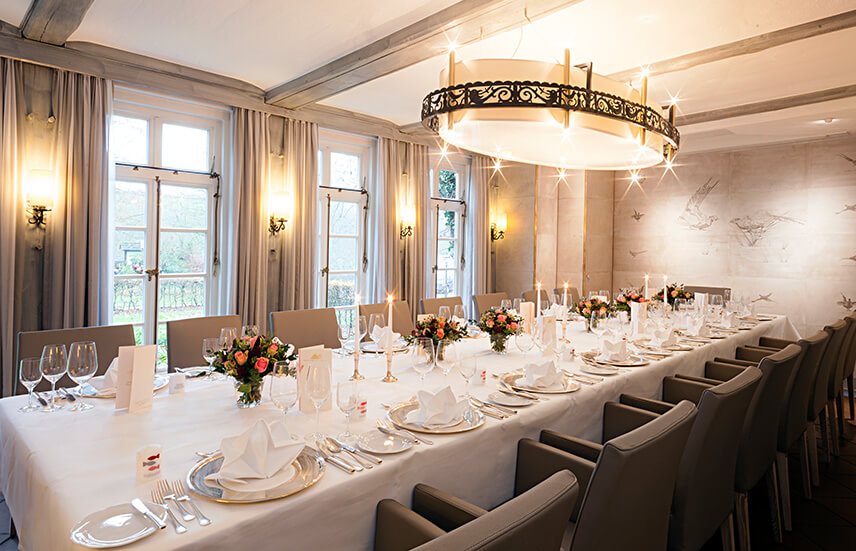Das Fasanenzimmer im historischen Haupthaus eignet sich für Feiern und Empfänge im kleinen Kreis mit bis zu 22 Personen. Der stilvoll gestaltete Raum bietet ein elegantes Ambiente in ruhiger Lage.