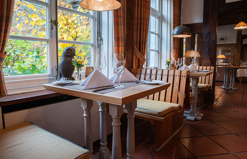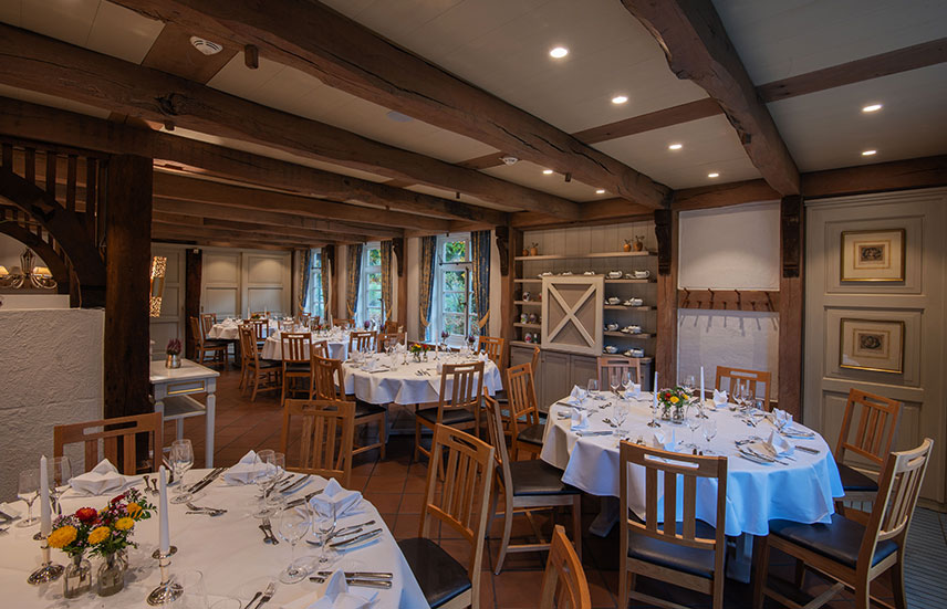 Das Restaurant im historischen Haupthaus bietet eine authentische Landhausatmosphäre und eignet sich besonders für kleinere Veranstaltungen. An Gruppentischen für bis zu 10 Personen lässt sich hier in persönlichem Rahmen feiern und genießen. Ideal für familiäre Anlässe oder Feiern mit überschaubarer Gästezahl.