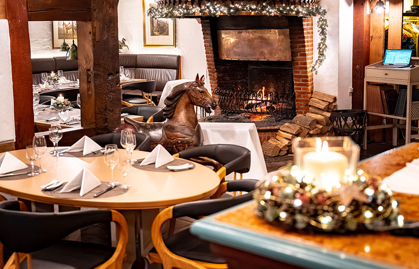 Der Kaminbereich schafft mit seiner warmen, urigen Atmosphäre einen besonderen Ort für Feiern im kleineren Kreis. Der Bereich eignet sich für Gruppen bis zu 20 Personen und lädt zu geselligen Stunden in behaglichem Ambiente ein.
