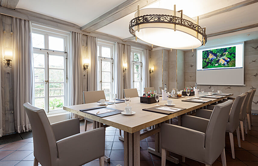 Der Raum ist fest mit einem Konferenztisch ausgestattet und kann ausschließlich in dieser Bestuhlungsform genutzt werden. Durch die direkte Anbindung an Restaurant und Rezeption ist eine unkomplizierte Betreuung während der Tagung gewährleistet. Der direkte Zugang zu einem kleinen Garten bietet sich besonders für Pausen im Sommer oder einen kurzen Moment der Entspannung zwischendurch an. Darüber hinaus eignet sich das Fasanenzimmer hervorragend als zusätzlicher Gruppenarbeitsraum im Rahmen größerer Tagungen.