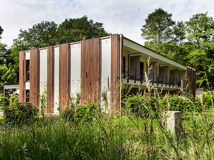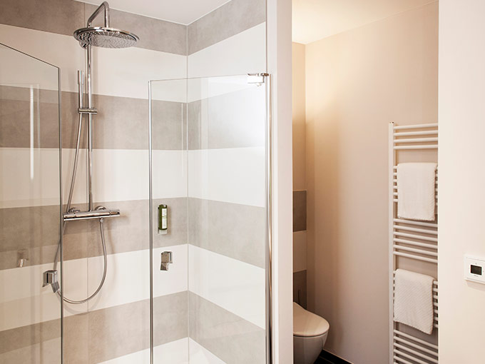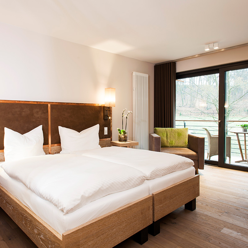 Alle Zimmer verfügen über großzügige Bäder mit begehbarer Dusche. Vom Waschbecken aus öffnet sich der Blick direkt in die Natur. Balkon oder Terrasse sowie große Fensterfronten lassen viel Licht herein und bieten einen wunderschönen Ausblick auf die extensiv genutzten Wiesen, die von Quellwasser gespeisten Bachläufe und den angrenzenden Wald des Natur- und Erholungsgebiets.