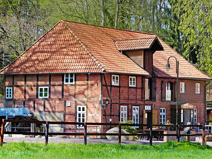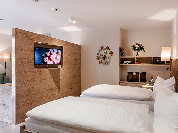 In der Klostermühle befinden sich zehn unserer neuesten Hotelzimmer, von denen zwei Zimmer zusätzlich mit einer kleinen Teeküche ausgestattet sind. Bei der Gestaltung wurde großer Wert auf hochwertige, natürliche Materialien gelegt: gehobelte Eichenholzdielen, maßgefertigte Möbel aus Eichenholz mit feinen Kupferdetails sowie ein bewusst textilfreies Raumkonzept sorgen für eine klare, moderne und hygienische Atmosphäre. Aus diesem Grund sind diese Zimmer besonders hundefreundlich.