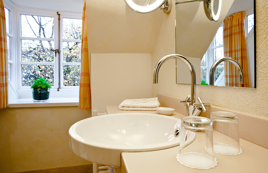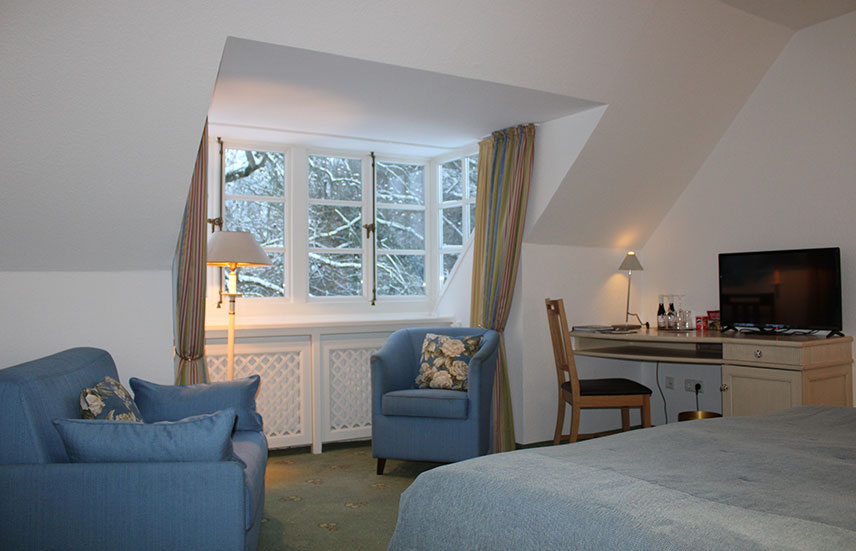 Jedes Zimmer verfügt über ein komfortables großes Doppelbett, ein individuell gestaltetes Bad mit Dusche oder Badewanne sowie – je nach Lage – einen schönen Ausblick in die Natur oder auf das Ensemble des Heiligenbergs. Die Comfort-Doppelzimmer bieten mit ca. 25–32 m² ein spürbares Plus an Raum und Komfort.